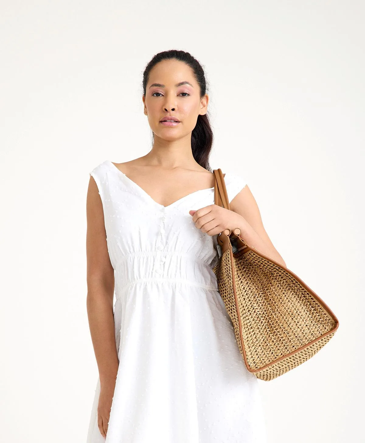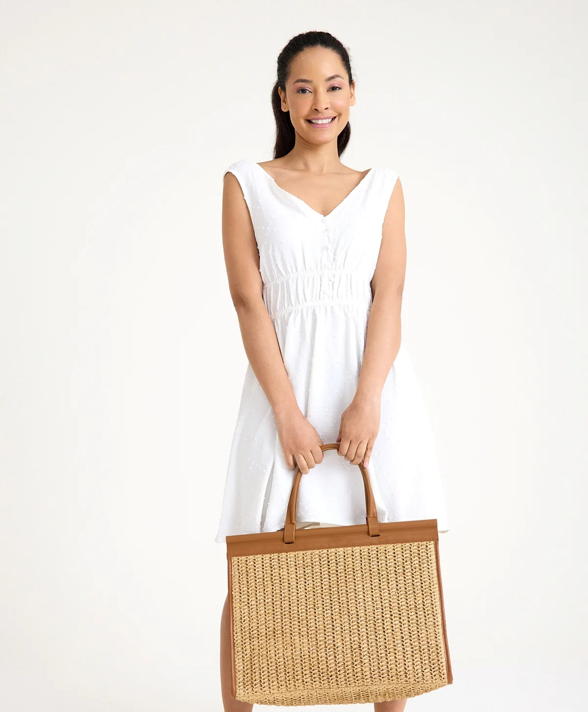 2025 sezonunun öne çıkan parçalarından Alina Rafya Hasır Çanta, doğal rafya kağıt ipten elde örülerek üretilen ve sınırlı sayıda özel renk seçenekleriyle sunulan bir tasarım harikası. 45 x 35 x 25 cm ölçülerindeki geniş yapısıyla günlük kullanımdan tatil seyahatlerine kadar her anınıza eşlik ediyor.