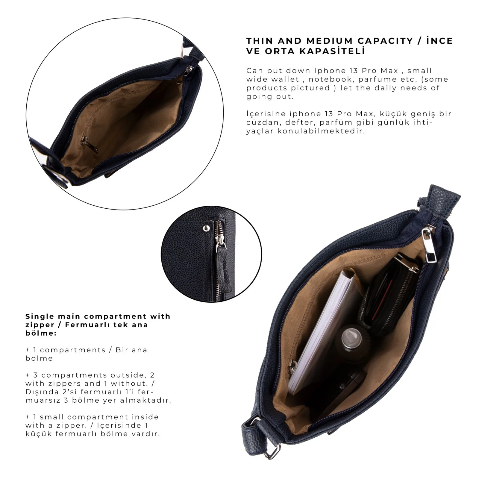 Ana bölme fermuarlı olup, Dış kısmında 2, iç kısmında 1 adet fermuarlı göz bulunmaktadır.