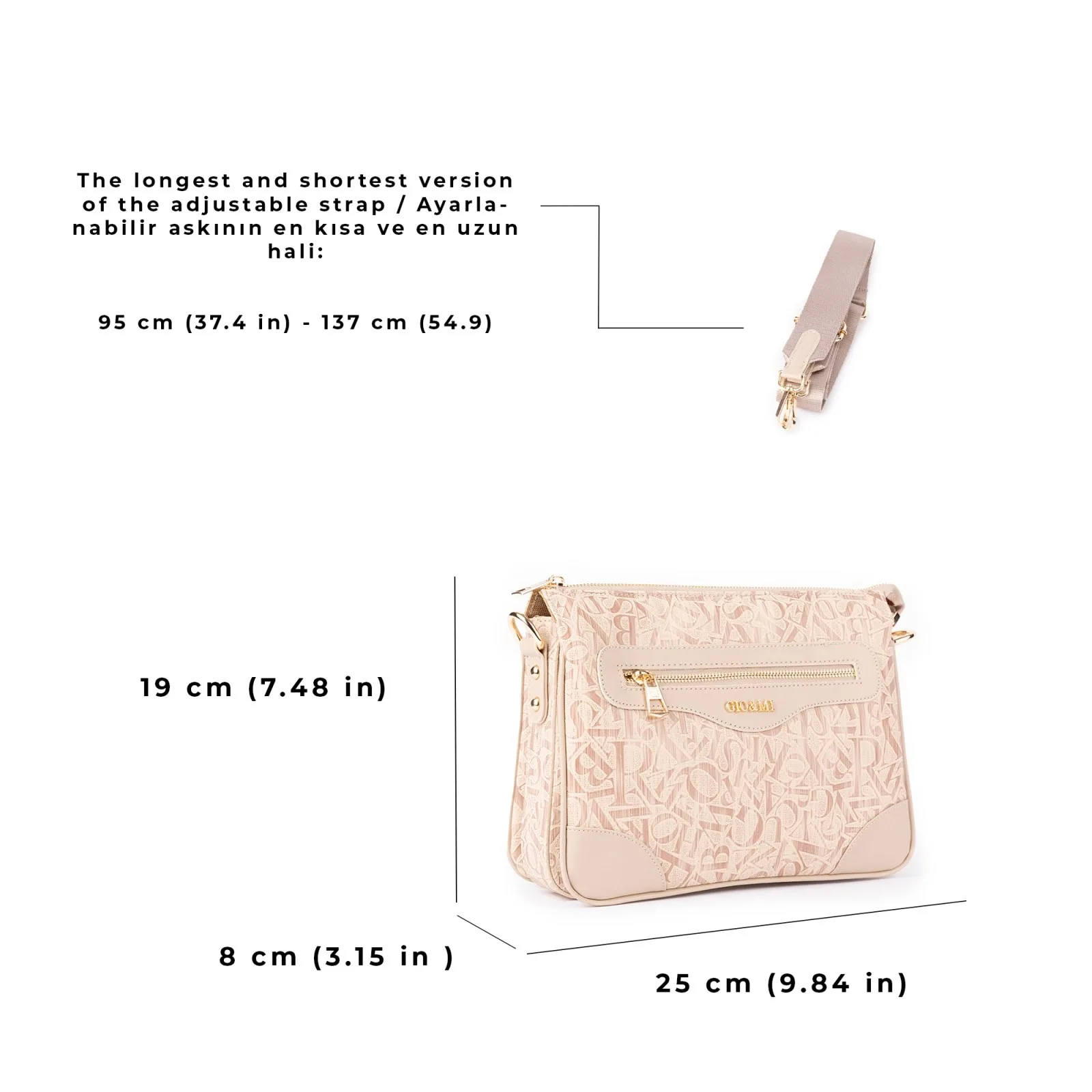 Gio&Mi Zeta (EE181306) çapraz çanta, fonksiyonel tasarımıyla da dikkat çeker. Fermuarlı cebi ve yan bölmeleri ile eşyalarınızı düzenli tutmanızı sağlar. İç kısmında %100 pamuk dokuma kumaş astar kullanılmıştır. 27 cm x 21 cm  x 11 cm ölçülerinde tasarlanan çantanın kullanım hacmi yaklaşık 4 Litredir. Üretim esnasında sağlığa zararlı olan hiçbir ürün kullanılmamıştır.